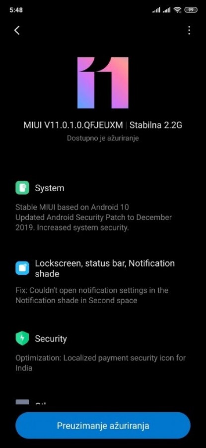 A 2,2 GB-os pakk MIUI V11.0.1.0.QFJEUXM buildszámon fut és már tartalmazza a decemberi biztonsági frissítéseket is. Az új rendszerrel jobb navigálás, teljes sötét mód és számos kényelmi szolgáltatás kerül fel a telefonra.